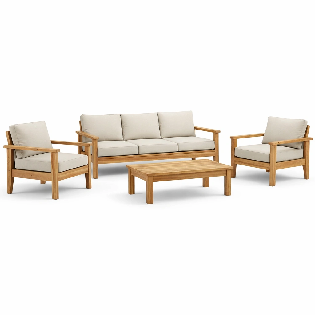 Product List: Un divano a tre posti, due poltrone singole, un tavolino.