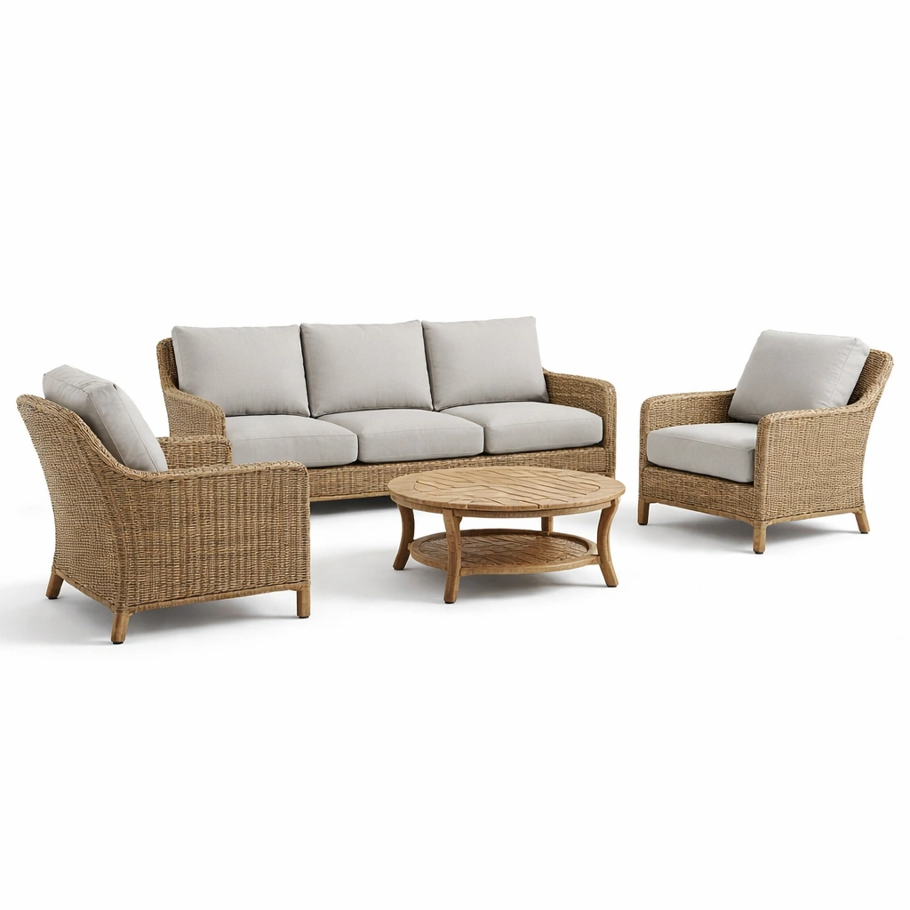 Materiale: Rattan sintetico intrecciato, cuscini in tessuto di poliestere, struttura in legno teak.
